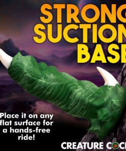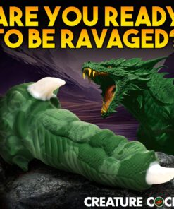 The dragon reaches for you, slides inside, and its green finger tipped with a tapered, white talon rocks your world! Every texture makes your eyes roll back in your head! The ribbed scales and the bumpy lizard skin combine for a mythical and epic experience! Made out of premium, flexible, phthalate-free silicone, this dong is body-safe and best used with water-based lubricants only. Enjoy hands-free rides due to the strong suction cup base! Invite a partner to indulge in kinky cosplay or fantasy roleplay and use their favorite harness to transform this dong into a strap-on! Afterward, make sure to wash it with warm water and mild soap, then spray it with a toy cleaner and air-dry. Keep out of direct sunlight and heat.