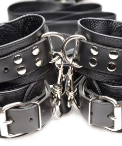 Better than your average bed restraint kit, this luxurious leather set with heavy-duty hardware captures the elegant atmosphere that you crave during your naughtiest private moments. Adjustable to fit any bed size, this system of bondage gear slides under your mattress, while each adjustable strap spreads out and emerges on the sides or head and foot of the bed, depending on how you like to play. Swivel hook clips connect to the D-rings of the sophisticated, leather wrist and ankle cuffs, allowing you to confine your lover in a variety of positions while you have your way with their helpless body!