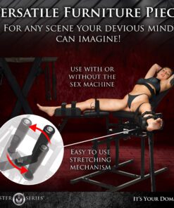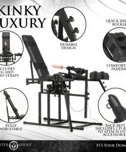 Get ready to put yourself in a precarious position… of pleasure! This bondage chair is built for making your partner or submissive obedient while you bring them over the edge of ecstasy again and again! It also doubles as a comfortable way to self-serve yourself some powerful poundings! Simply lean back, put your legs up, and enjoy premium, kinky luxury with this adjustable bondage chair and compatible sex machine attachment! Now you can position yourself or your partner at the angle that works perfectly for you both. This chair has a heavy duty frame that can handle up to 330 lbs (149 kg). With an adjustable backboard, you can sit them upright with legs stretched out or lifted high and wide, or lay them back so their body relaxes and stretches out, their chest and belly exposed to an array of pleasure and pain. Their leg height can also be adjusted for their comfort; get the perfect angle to hit their A-spot, G-spot or P-spot! The whole chair is adjustable both for your comfort and theirs! As they sink into the plush, foam cushions covered with vegan leather, they’ll be able to handle longer scenes and their body will have some padding to push into as you play with them! To keep them in place, there are straps with plastic buckles that easily secure their legs and chest. Whether it’s to keep them safely bound or to keep them from writhing too much in pain or pleasure, these adjustable straps have a quick release function so they can get on and off easily. On the back of the board are D-rings for wrist cuffs or other bondage accessories to clip to.