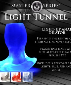 After doing any needed warm-up stretching, lube up the dilator and slip it inside. Place your fingers inside the tunnel to help guide it in until the sphincter squeezes around the neck and the toy stops at the flared base. To make things easier, have the LED light already inserted into the toy and turned on. Then enjoy pouring any fluids or liquids into the tunnel, or gaze into the gaping hole, or see if you can insert an anal-safe toy inside the tunnel for extra stimulation. Have fun with this illuminated booty and enjoy!
