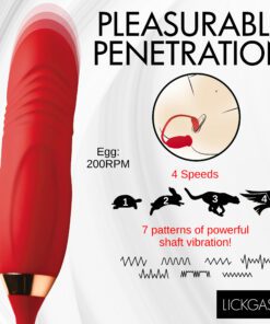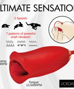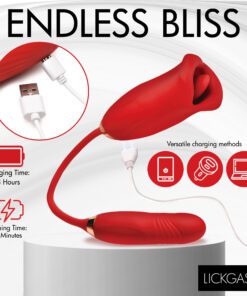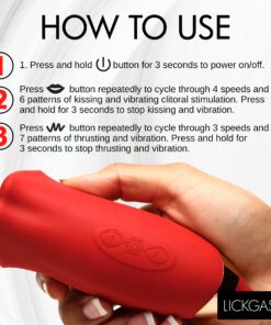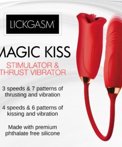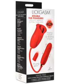 This sexy lipstick lover has two ends; one for inside and the other to kiss your hooded pearl. Enjoy the Magic Kiss clitoral stimulator and thrusting vibrator! The kissing mouth has 4 speeds and 6 patterns of clit-stimulating vibration and mouth movement. The bullet vibrator slips inside and offers 3 speeds and 7 patterns of powerful thrusting and vibration! Combine the two for a sensational and orgasmic experience! Made out of silky smooth, phthalate-free, body-safe silicone, this premium quality toy is best used with water-based lubricants only. Take it in the shower, too! It’s rated IPX6 waterproof so it can handle those powerful jets as you let go in a steamy setting! Do not submerge underwater, though. To recharge, use the USB cable provided. To clean, wash with warm water and mild soap, then rinse it and spray with a toy cleaner before letting it air dry.
