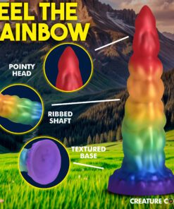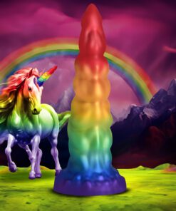• Fantasy Dildo: This iridescent rainbow unicorn horn is tapered and has gradually larger bumps along the shaft.