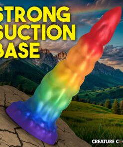 Indulge in this fantastical unicorn and enjoy this iridescent, shiny, rainbow horn! The tapered tip of the horn makes insertion easy and it gets wider the deeper you go! Enjoy the larger and larger ribs along the shaft as you get deeper. The wide base provides powerful suction so you can go hands-free by placing it on any flat surface to keep it in place. You can also combine it with a compatible strap-on harness for pegging play! Made from premium, phthalate-free silicone, it has a firm core and soft, silky surface. Explore every sci-fi, fantasy, roleplay, or cosplay scene you want with this epic adult toy! Use only with water-based lubricants for best results. After play is over, wash the dildo with warm water and soap and use a toy cleaner to spray clean. Wipe dry and store in a cool, dark place out of direct sunlight.
