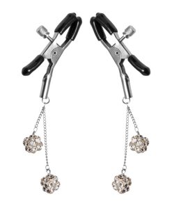 This sparkling set of rhinestone adorned nipple clamps will give you a dazzling way to make sure their eyes stay on you! The cube shaped embellishments are set on all sides with clear sparkling gems which catch the light with every movement. The clamps themselves are vinyl coated, with a thumb screw that allows you to adjust the tightness as you need it. The adjustable pressure make them ideal for all experience levels.