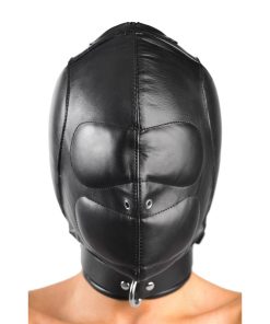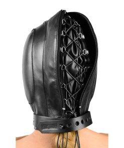 This exquisite leather hood features internal pads over the ears and eyes to block out sound and light, as well as provide a more snug and comfortable fit. A sturdy, adjustable collar with lockable closure toggle surrounds the neck and features a metal D-ring in the front that allows you to attach additional bondage gear as your set-up requires. Lacing runs from the top of the head to the nape of the neck, and a soft leather inner panel prevents hair from becoming tangled in the laces. The hood also zips closed in the back to cover the laces, if desired. Grommeted metal breathing holes in the front of the hood give your slave access to air. With their other senses dulled, your sub will have nothing to do but focus on the pleasure or pain that you allow them!