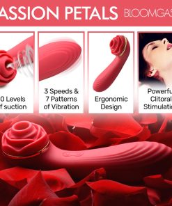 Turn on the toy and get ready to be turned on as you grab your favorite water-based lube. Start with the vibrating shaft and massage your sensitive areas, letting the blood flow increase and teasing yourself a little. Then switch the toy around so you are using the passion petal rosebud and begin to massage it over your clitoris until it captures it in its sucking petals. Pull it away and then press it back on again, then repeat as you amplify the sucking sensation and gently pull at your bean! Continue until you edge yourself to full release!