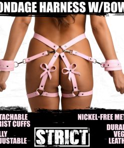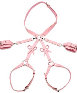 The use of your body is a gift; treat it like one with this bondage harness and wrap up your waist, thighs and wrists like a nice, little package -it even has bows included! Made out of pink, durable PU faux leather, it is vegan friendly and easy to spot clean or wipe clean after each use. The wrist cuffs close using nickel-free, silver colored metal buckles. Adjust the buckles on the thigh straps, waist strap and wrist cuffs for a custom and comfortable fit. Accentuate your curves and make your partner drool with lust and desire as you present yourself as the object of their admiration, a bound and submissive playmate ready to spice up the night!