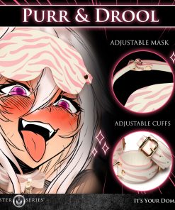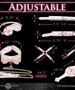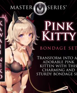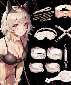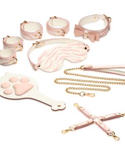 The perfect tiger kitty kit to make you go “UWU”! Dress up yourself or your partner in bondage that really makes a statement. This unique rose pink, soft peach and white set is made out of vegan friendly leather and held together with beautiful gold plated metal rivets. Included in the kit are pairs of wrist and ankle cuffs, a kitty collar with a bow, faux leather blindfold, a 4 strap hogtie to hold wrists and ankles together, and an adorable kitten-paw paddle! The leather is white with a rose pink tiger stripe print all over it. Each of the cuffs are adjustable for comfort and have D-rings for the hogtie or other bondage gear to attach to. The long, golden chain connects to the cute kitty collar and has a leather handle. The paddle is shaped like a cat head but has a plush, padded side with a large cat’s paw print on it that is cushioned and feels thuddy and a flat side that offers a more stingy feeling. All metal is nickel-free for sensitive skin. Spot clean vegan leather as needed by spraying with toy cleaner and wiping dry with a soft cloth.