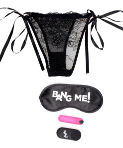 Power up your panties with this kit of hidden pleasure! This pair of lacey black panties fits most sizes and features a vibe pocket for the included bullet vibrator. Perfect for playing around the home – have your lover slip this pair of panties on and buzz them when they least expect it with the included remote controller! Remote controller works up to 25 feet away, and runs on 1 CR2032 battery (included).