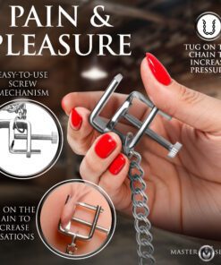 Looking to amplify your experiences with pain and pleasure? These vice clamps are the answer. Their adjustable screws let you control pressure precisely, ensuring a personalized experience every time. Designed with a durable connecting chain, they enable tugging and pulling for enhanced pleasure. Plus, crafted from nickel-free, body-safe metal, they’re perfect for sensitive skin. Explore temperature-based sensations by warming or cooling the metal. These accessories offer an unmatched solution to achieving new heights of thrilling exploration.