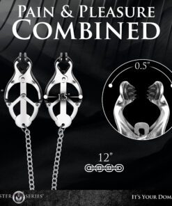 After you’ve warmed up your submissive partner, you grab the clamps. You rub the nipples to get them to wake up and become perky. Then you pinch the nipple, pulling it away from the chest, and clamp the ends of the clover clamp right behind the nipple, on the areola. You slowly, very slowly release so the pressure builds and doesn’t shock them. Then you slowly release the clamp so they can feel the added weight of the metal clamp and feel the spiked tips digging in. You remind them to breathe, let them calm down and center, and then do the same on the other side. You play with them as usual, adding in light slaps and tugging their hair, using a Wartenberg wheel over their flesh and flogging them. Then after about 30 minutes or less, you release the clamps and enjoy the look on their face and their cry of pain as the blood rushes back, awakening the senses in their nipples once more!
