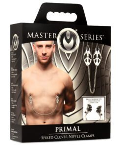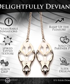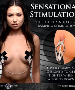These aren’t your normal nipple clamps! Designed after the classic, painful clover clamps these have an added twist! Not only do they increase in pressure when you pull the long, 12 inch chain… They also have spiked rubber tips that dig into the skin and give you an extra bite of pleasure and pain! Made out of nickel-free metal they are perfect for those who like intense nipple stimulation and have sensitive skin. To clean, simply use warm water and mild soap and soak the chain and clamps in them. For more serious cleaning, use a combination of rubbing alcohol and water. Spray with a toy cleaner for good measure after each play session and keep them on hand or slip them into your toy bag to add some spice to any scene!