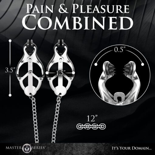These aren’t your normal nipple clamps! Designed after the classic, painful clover clamps these have an added twist! Not only do they increase in pressure when you pull the long, 12 inch chain… They also have spiked rubber tips that dig into the skin and give you an extra bite of pleasure and pain! Made out of nickel-free metal they are perfect for those who like intense nipple stimulation and have sensitive skin. To clean, simply use warm water and mild soap and soak the chain and clamps in them. For more serious cleaning, use a combination of rubbing alcohol and water. Spray with a toy cleaner for good measure after each play session and keep them on hand or slip them into your toy bag to add some spice to any scene!