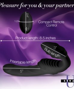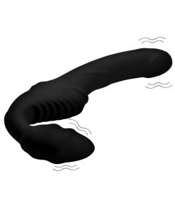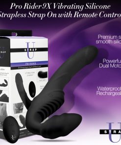 With a push of the button on the remote control, send vibration into the slender shaft and the textured bulb of this double-sided dildo. This rechargeable pleasure tool features dual motors to provide you with 3 speeds and 6 patterns of powerful internal thrumming for both partners. The single control button on the Pro Rider is easy-to-use and accessible during penetration, but a remote control makes it even more convenient and exciting! The silicone remote fits easily and securely in your hand while you immerse yourself in intimacy, granting access to all 9 functions. Both ends of this artfully designed double dong are shaped for the ultimate in ecstasy: the bulb is adorned with gentle waves while you grind your clit against bold grooves of the front pad. Meanwhile your partner will be treated to a narrow, comfortable shaft with a slight ridge. It is even waterproof so that you can take your play into the shower, bath, pool, and more! Explore greater intimacy with a vibrating double-ended strapon dildo. Made of silky silicone, the Slim Rider is non-porous and phthalate-free. Clean with warm water and mild soap or toy cleaner and avoid use with silicone lubricants.