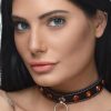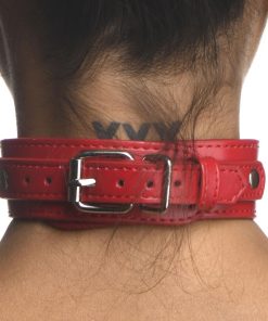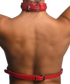 Show off your gorgeous body and share your flair for kink with this chest harness! The top of the harness wraps around the neck to serve as a collar then comes down between the breasts to split off and wrap around to the back. The harness accentuates and complements the shape of each breast and has a halter-top look from behind. Each long strap has many holes in it so you can place the prongs through them to adjust for a perfect size! With buckle closures you have a comfortable yet secure fit. The harness adjusts from the neck to the center of the body (the xiphoid process), around the neck, and along each side of the ribs. There are two large D-rings at the top and the bottom of the harness on the front and two small D-rings on either side along the ribs. These can be used to attach leashes or other accessories and bondage implements to. Made of durable vegan leather, it’s perfect for every type of body and preference. Plus, it looks incredibly sexy with or without clothing and can be used to accessorize any kinky outfit! All metal is nickel-free. Spot clean as needed. Avoid exposure to oils and use only water-based lubricants while wearing during a play session for best results.