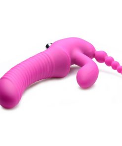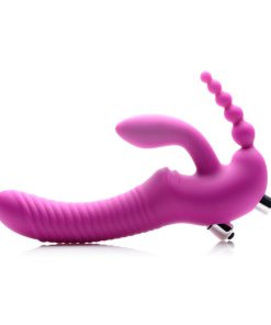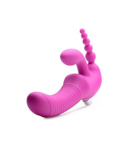 Ergonomically designed for the female body, this strapless strap-on provides clitoral, vaginal, and anal pleasure to the wearer while delivering a textured shaft with which to penetrate their partner. Furthermore, this remarkable couples toy thrums throughout all stimulation points with the power of two vibrating bullets. The bottom will appreciate a rippled, slightly curved shaft, perfect for stimulating the G-spot or P-spot. Meanwhile, the clitoral pad has two ridges that provide immense pleasure to the top with every thrust. A smooth penetrator is curved to directly target their G-spot, as well. Finally, the beaded anal stimulator provides a thrill of ecstasy as the seamless bulbs hum delightfully. This all-inclusive tool is waterproof, for enjoyment in all settings and an easy clean with mild soap and water. Made of premium silicone, it is non-porous, phthalate-free, and not compatible with silicone lubricants.