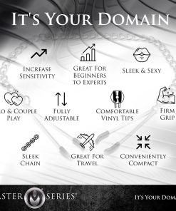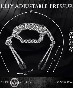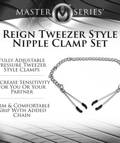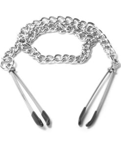 These sexy tweezer nipple clamps are designed to exert either light or strong pressure with a simple sliding clamp. Vinyl coated ends attached to a linked chain. Your plaything will love the variation between light and intense pressure, and the chain serves as a visual adornment for a sensual look.