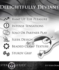 A comely device of restriction and paradise. The Ringed Monarch is an effective training tool in the art of endurance and sensation play. These devious chrome clover-style clamps are ideal for solo play or with the one you want to dominate. When the O-ring is pulled, the clamps pressure becomes more intense. Use your imagination, this devious set includes a convenient O-ring that can be weighted, laced, and more. In your domain: you decide.
