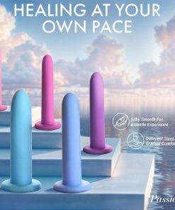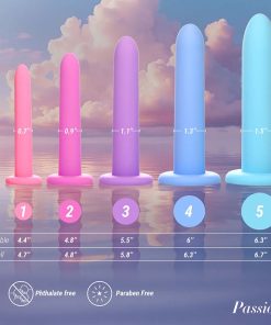 Introducing our premium-quality, body-safe silicone vulva dilator and kegal exercise set. Designed for gentle and comfortable use, each piece is made from silky smooth silicone that glides effortlessly with a touch of water-based lubricant. With five graduated sizes, this set allows you to build your confidence, strength, and control gradually, starting from the smallest size (Step 1) and progressing to the largest (Step 5). The smooth, tapered tip ensures easy insertion, and the suction-cup base lets you enjoy hands-free use on any flat surface. Perfect for those experiencing pain during penetration, these pelvic dilators can help you stretch your pelvic floor muscles and relieve tension effectively. They can be used to relax the muscles or, alternatively, you can squeeze them by doing kegels and strengthen the same pelvic muscles.