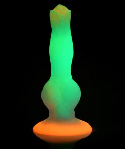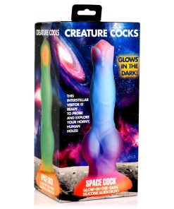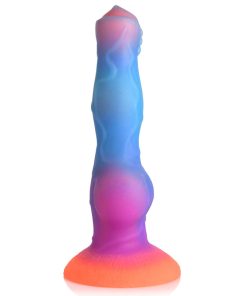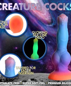 Take your fantasy roleplay, kinky cosplay or creative roleplay further with tangible fantasy toys from Creature Cocks! This Glow-In-The-Dark Alien Dildo might just be the perfect space canine for your carnal pleasures! With a bulging knot at the base, veins popping out along the shaft and a foreskin that has triple beads along the edge, it’s also intensely colorful! The psychedelic colors start with the sunburst of reddish orange at the base and continue into purple and blue along the shaft! Embedded in the silicone mold is glitter that shines even more cosmically when the dildo is exposed to sunlight or UV light so that it glows! The wide base provides powerful suction so you can go hands-free by placing it on any flat surface to keep it in place. You can also combine it with a compatible strapon harness for pegging play! Made out of premium, phthalate-free silicone, it has a firm core and soft, silky surface. Use only with water-based lubricants for best results. After play is over, wash the dildo with warm water and soap and use a toy cleaner to spray clean. Wipe dry and store in a cool, dark place out of direct sunlight.