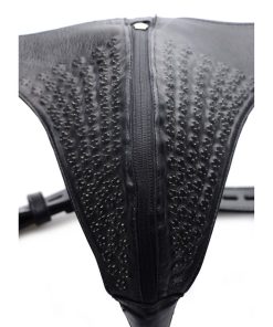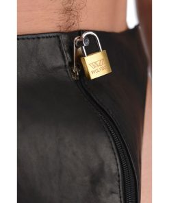 Keep your slaves cock confined in this evil leather jockstrap! Lock him into the luxurious leather straps to put him through a special kind of hell! The interior of the front panel is lined with hundreds of tiny, sharp spikes that will dig into your playthings delicate genitals. A zipper allows you to access his tormented flesh and permit him to urinate, but you can also secure the hole of the zipper to the peg above it with a lock, keeping him trapped in chastity until you decide to show mercy. All straps secure with attractive locking buckles, adjusting for a wide range of body types.