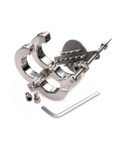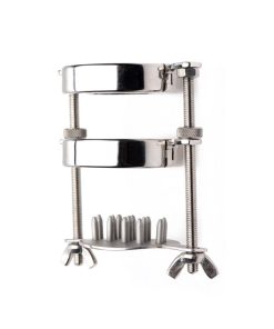 This CBT tool will make you wonder what the heck you were thinking! The weight alone will test your endurance, pulling down on your scrotum with over a pound of metal. Experience the painful pleasure on your own or with a partner, using the allen wrench to open and close the rings. Customize the experience by adjusting the nuts and fasteners to control the positioning of the rings on the shanks. Finally, this wicked device introduces another element of agony: wing nuts control a plate of sharp nails that can be raised to prick at those desperate balls! Each of the 19 points will deliver delicious agony while the stretcher and gravity do their work!