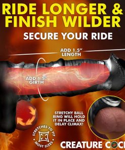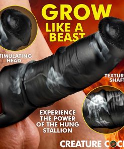 Take your intimate play to a new level with the Stallion Silicone Penis Extension! Transform into a wild equine stud with this incredible sheath that promises to leave your partner in awe. With a substantial increase in length and girth, this extension provides the perfect boost for heightened pleasure. Featuring a wide, flared equine head that ensures deep, ecstatic moans with every thrust, the realistic texture of the veiny, black and gray shaft delivers a sensational experience. The stretchy ball ring keeps everything in place and extends your performance. Made from body-safe, premium silicone, it’s a must-have addition for adventurous couples. Remember, use only water-based lubricants for optimal performance.