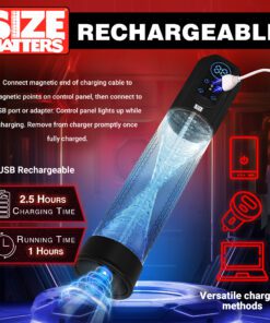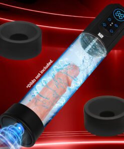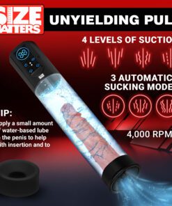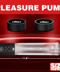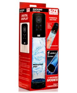 Give yourself a boost with this sucking penis pump! The clear, plastic case attaches to a powerful, sucking motor with an easy-to-read display! On the other end, you can attach either the 20mm or 25mm silicone sleeves and slip your shaft inside to get swollen from the suction and pressure! The display shows you the exact amount of pressure and is easy to control and use. Choose between 4 intensity levels and 3 suction modes that stiffen your willy and suck your rod intensely! Rated IPX7, it is waterproof and can be submerged underwater for up to 30 minutes! Enjoy it in the shower or bathtub for a unique, wet experience! Want to switch it up? You can use this tool to get hard and then swap out the sleeves provided for a realistic, textured sleeve and enjoy the sucking sensation as you stroke yourself! All the pieces are detachable so you can easily clean up. Simply remove the motor from the case and slip off the silicone sleeves. Wash with warm water and mild soap, then rinse, spray with a toy cleaner and pat dry.