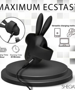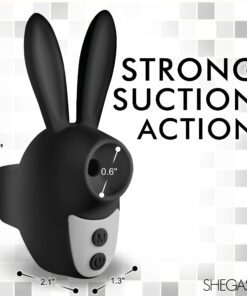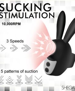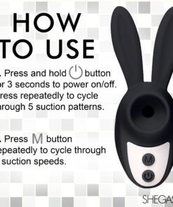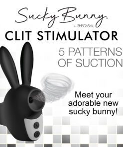 This Sucky Bunny Clit Stimulator is the cutest addition to your toy collection! Its long ears won’t be your favorite perk, however. Enjoy 3 speeds and 5 patterns of suction from the little hole at the front! This will be sucking on your little pleasure pearl so well that you’ll feel as frisky as a rabbit! The handle on the back lets you slip one or two fingers in so you can easily hold it against your pleasure bud. Ergonomically designed so you don’t have to bend your wrist and small enough to not get in the way when you and your partner are face to face, this bunny is perfect for passionate, private moments! Use it alone or with a partner, take it on travel trips, or simply keep it beside your bed for when the mood strikes! Made out of premium, phthalate-free, body-safe silicone, it is best used with water-based lubricants. Rated IPX5, it is splashproof and can handle getting wet, but shouldn’t be brought in the shower or bathtub. Recharge the bullet via the USB cable provided. To clean, wash with warm water and mild soap, then rinse it off and spray it with a toy cleaner before patting it dry.