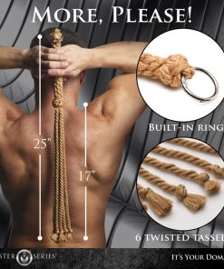 Take your impact play up a notch with this 6 tailed rope whip! Made of nylon, it is highly absorbent, durable and built to last! The knots on each end of the falls add an extra bite to each throw. Each fall is twisted so it stays tightly together and they are braided together along the handle. The firm handle... Read more