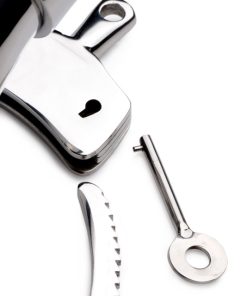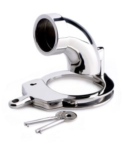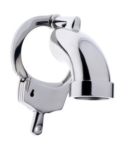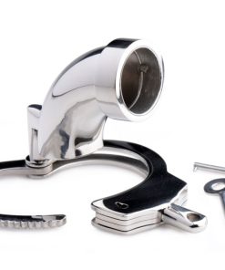 Handcuff your slaves desires with the Cock Cuff Chastity Device. This device is made from a stainless steel handcuff and has a steel tube welded to the front to make sure all pleasure is under your lock and key! The opened end allows for use 24-7. The device comes with an L-shaped bar extending from the penis lock to halfway over the cage.