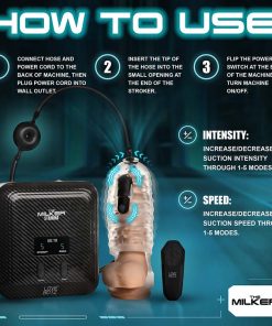 Want to dive into hours of pleasure and increase your sexual stamina? This Milkera Stamina is for you! You deserve hands-free pleasure that builds in ecstasy, and keeps you right on the edge while training you for long nights of passion! With the intense Milker Stamina device, you can enhance your pleasure with our advanced automatic milker, engineered for the ultimate indulgence. This sophisticated device includes a TPE sleeve with a securing ring that wraps around the balls and acts as a C-ring, plus a powerful rechargeable bullet that vibrates in 3 speeds and 7 patterns and slips into a pocket on the side of the sleeve. Choose from 5 speeds and 5 suction patterns for a mindblowing experience with settings that are easily adjusted using the large blue buttons on the device or via the battery-operated, remote. See what setting you’re exploring and easily read the bright, LED display. The 46-inch hose, fitted with a circular valve, prevents fluid ingress into the machine. Ideal for globetrotters, it comes with a power adapter and interchangeable plugs for US, UK, EU, and AUS compatibility.