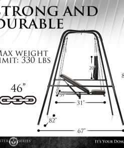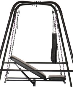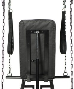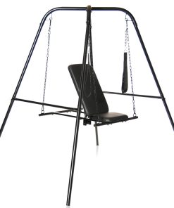 This swing is unlike others. For those who want support and a padded but firm surface, this swing is a floating chair or bondage table that makes your experience weightless. As you defy gravity and push the edges of your kinky comfort zone in intense or stimulating scenes, find yourself securely above the ground on this chair swing suspended from a durable, steel frame that can hold up to 330 lbs. The chair hangs via chains from the easy to assemble frame. Stirrups are included and allow you to elevate your legs or grab on with your hands, depending on your position. Fully adjust the height so your partner can enjoy ergonomic penetration and play! Adjust the angle of the chair from 90 degrees to 180 degrees to go from sitting up to laying back and find which angle gives you the perfect angle to hit your A-spot, G-spot or P-spot! The comfortable, padded chair is covered with vegan friendly, easy to clean, vegan leather.
