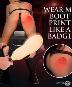 After thoroughly warming up your partner’s rear end, you rub it gently. They’ve been such a good playmate and have taken every impact tool until now. You pull out the sinister boot paddle, one side with a rubber boot print and the other smooth and hard, and rub the smooth side on their backside. You don’t let them know what’s coming so their shriek of shock when the hard, textured rubber of the boot side slaps them across their derriere takes them by surprise! You didn’t hold back, and the print shows up quickly in bright red, a satisfying sight on a well-appreciated booty.