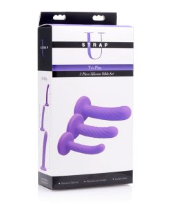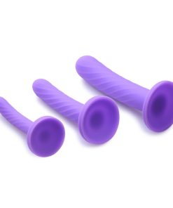 This set of 3 silky, smooth dildos is perfect for getting you accustomed to vaginal or anal penetration. Your tight hole needs to be coaxed and pleasured before it allows entry of a big dick or dildo, so start small with the finger-sized shaft. Subtle swirled ridges protrude for a delicious texture as you insert. Protruding more in the longer and girthier medium-sized shaft, they will massage the walls of your orifice as it slides in. Finally, your body will be ready for the largest of the three dildos. Savor the sensation as it pushes into you! The slight curve on each one will ensure that the right place is stimulated: the P-spot in male ass and the G-spot when used vaginally on a woman. The suction cup bases make them perfect for solo use, sticking firmly to most smooth, hard surfaces. Made of quality silicone material, these purple shafts are firm, yet flexible. The material is non-porous, cleaning easily and effectively with soap and water. Avoid use with silicone lube.