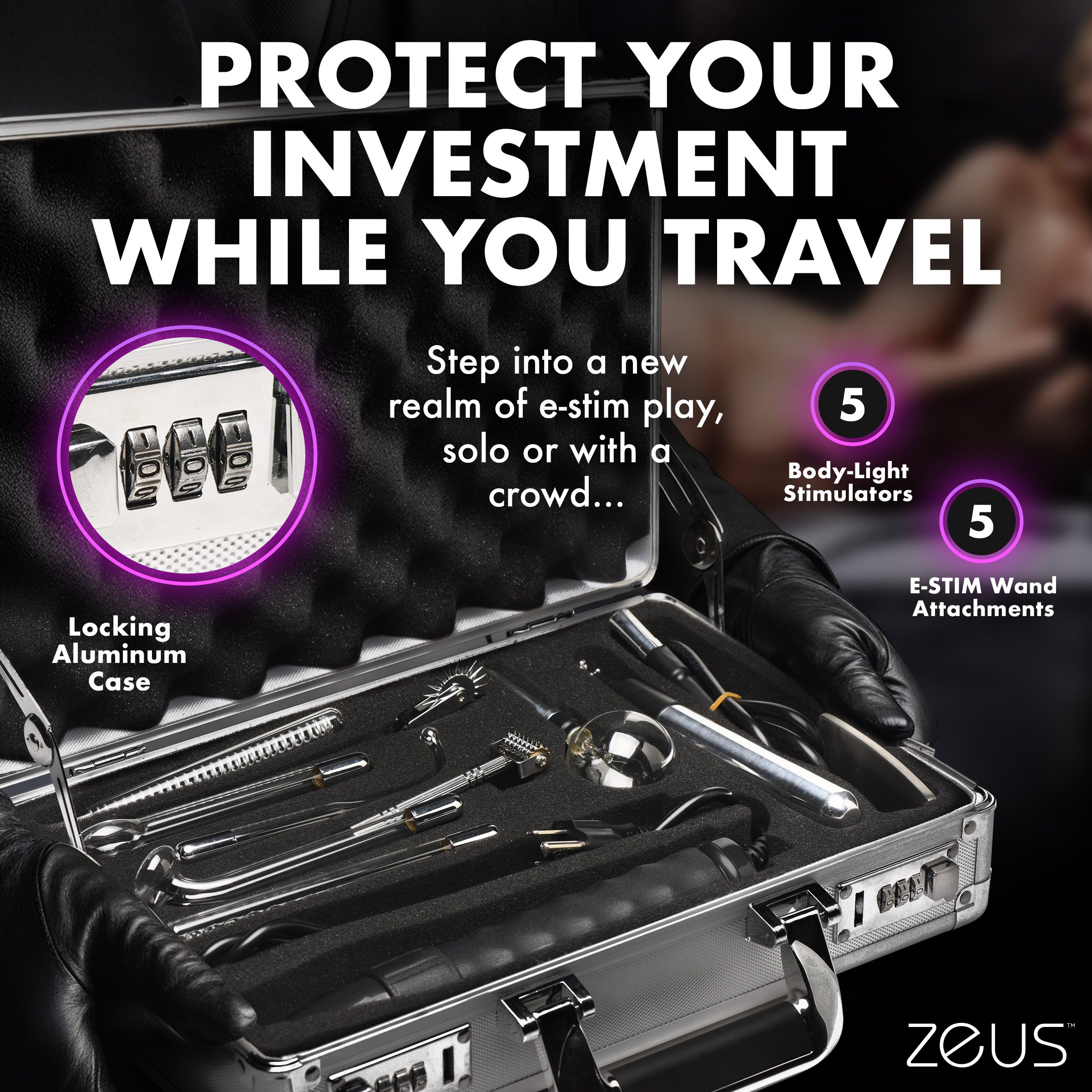 • Amaze your partner with visual and sensational delights! Dive into thrilling sensations with this complete violet wand kit designed for electrifying fun. Packed securely in a sturdy metal aluminum and wood case, it includes everything you need to create an unforgettable and electrifying scene. Experience the mesmerizing purple glow emitted from each of these classic violet wand shapes! Explore the unique sensations of each electrode and try out the comb, mushroom, pinpoint, spoon, balltip, and plasma globe. Enjoy the steady, strong electric current of these solid-state wands for smooth, uninterrupted play. Adjust the intensity to cater to each person you play with. Go beyond the glowing glass and elevate your experience with conductive metallic tools like the Wartenberg wheel, Rollenstein, and ball chain flogger. Get intimate and use the body contact plate, allowing your entire body to transmit tingling electricity with every touch. Just plug in and play—no power box needed!