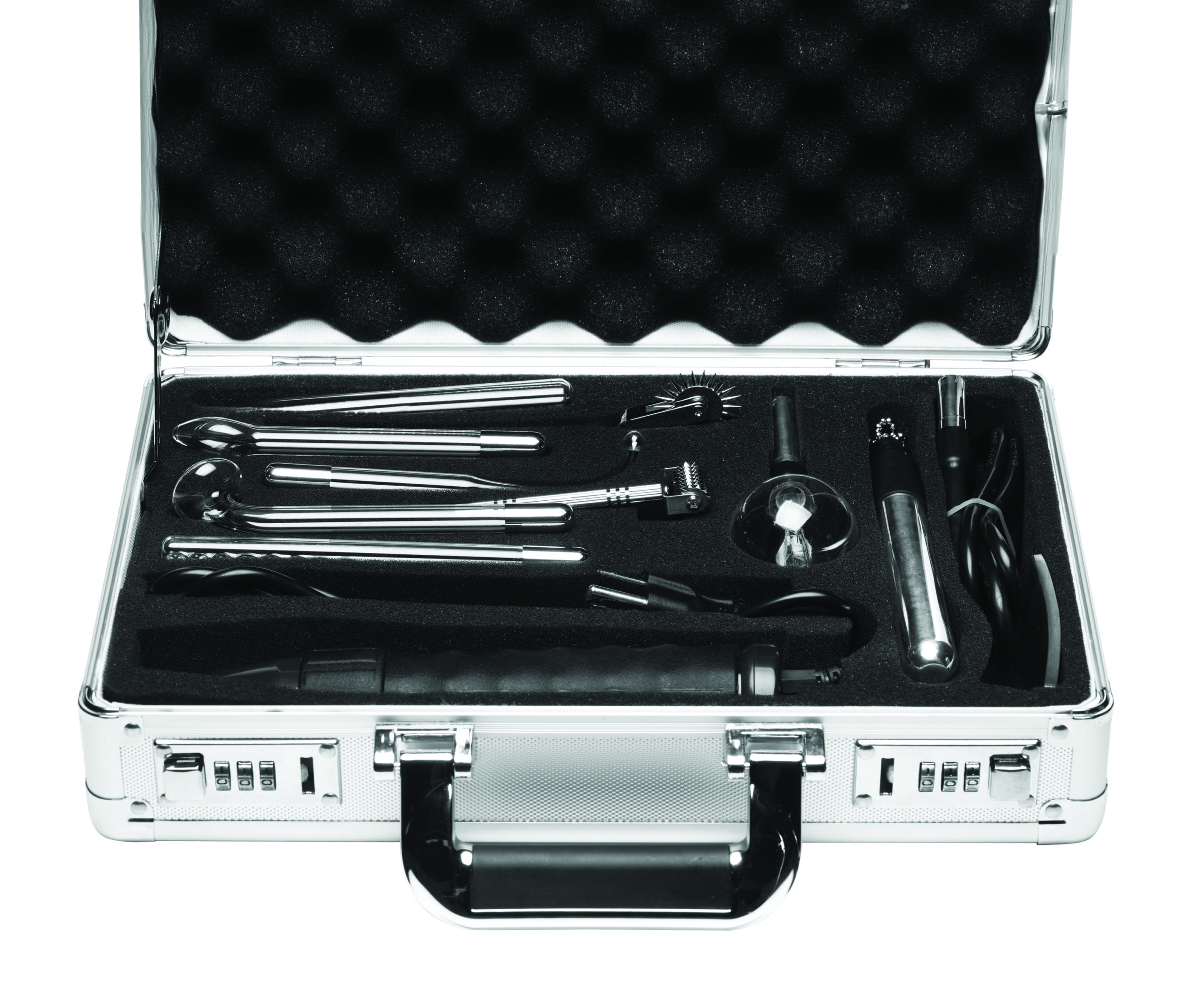 • All In One Kit: Everything you need for violet wand electrostim play packed neatly away in a protective metal case.