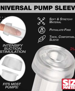• Introducing the Universal Pump Sleeve, an essential for anyone using a penis pump. Made from a soft, stretchy material, it easily adapts to most cylinder openings. The thick sleeve provides an excellent cushion, offering maximum comfort as you slide your shaft into the hard pumping cylinder. With body-safe, phthalate-free rubber, you can ensure the best care for your skin. Designed to enhance most pumps, it increases comfort, improves the seal, and boosts overall efficiency. Invest in the Universal Pump Sleeve for a more pleasant and effective pumping experience.