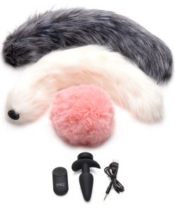 For all animal play enthusiasts, enjoy this trio of tails to play with! This kit offers one white fox tail, a gray fox tail and pink bunny tail. Complete with a silicone, anal plug to attach the tails to, this kit gives you options to play the predator or the prey! This kit adds a little extra buzz of excitement by pairing with a plug that vibrates! Enjoy 3 speeds and 7 patterns of powerful vibration to inspire your animal pleasures. Use the remote to control the settings while it s inside; control it yourself or, for added fun, hand it to your partner to control! Pair your vegan-friendly, faux fur tails with a matching outfit or accessories to really bring your animal to life! Indulge in primal play with different personalities; the wintry white fox tail brings out the innocent and demure, the pink bunny tail is waiting to hop into action and make you and your partner blush as you wiggle your bottom and flirt, and the gray fox tail is scrappy, playful and ready to pounce on their prey!
