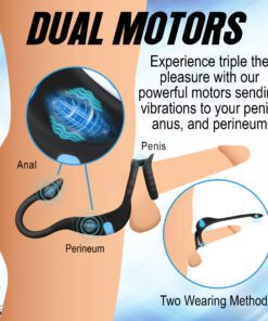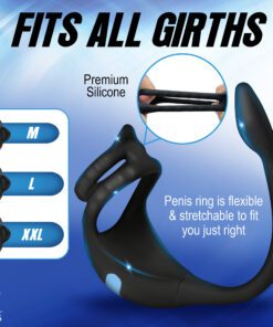 To place the toy on your shaft, start with the plug facing towards your backdoor, then slide one testicle at a time through both of the stretchy rings. Once both rings are around your balls, pull your flaccid shaft through the second ring. If your skin is getting tugged or pulled, use some lube on your shaft and the rings to slip it on easier. Once it’s in place, start to stroke yourself or use a penis pump to get hard. Then, if you’re ready, use some lube on the prostate plug and slip it gently into your rear end. Finally, turn the toy on, pair it with the remote, and enjoy trying out the settings! Play with yourself or invite your partner to ride you as you ride the edge of pleasure and extreme sensation!
