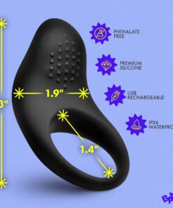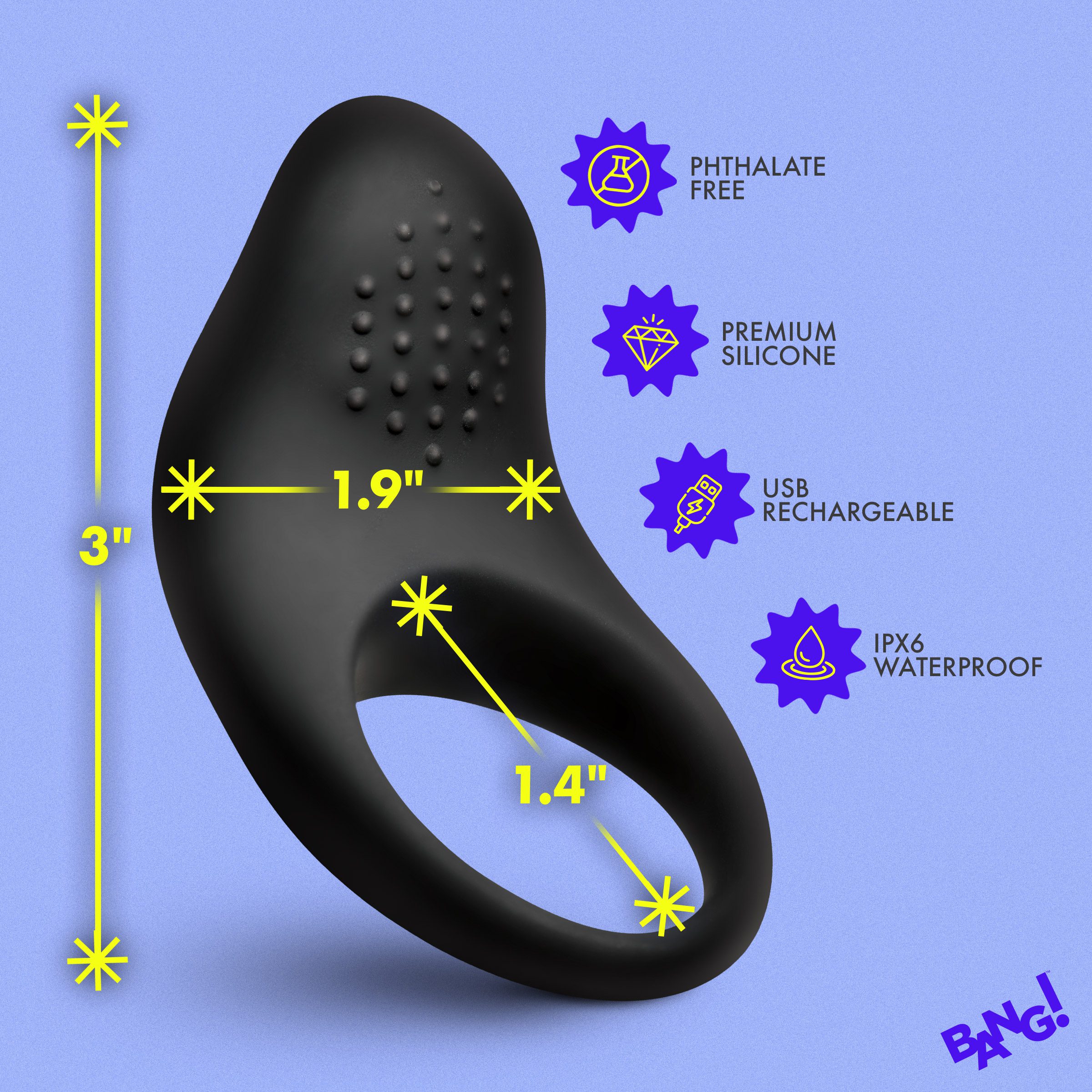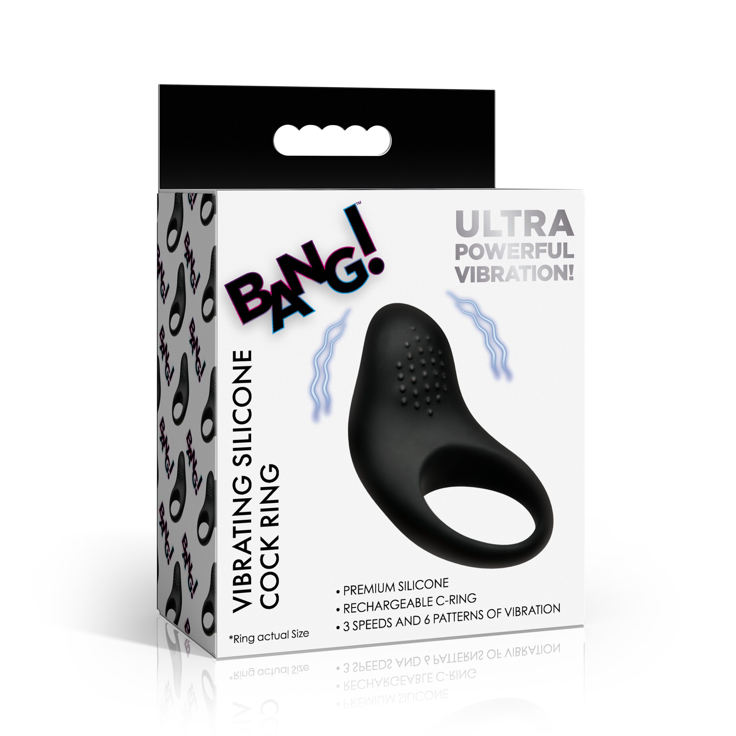 The Bang! Vibrating Silicone Cock Ring is a rechargeable couples vibrator built from premium body-safe silicone and ABS plastic. The soft clitoral stimulation pad sits flush against the body during