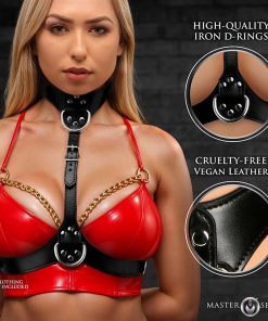 Introducing our Durable Vegan Leather Harness, a sexy and resilient piece designed for the confident woman. This harness highlights your chest and enhances your natural figure, ensuring you look your best. The built-in, adjustable collar adds an extra touch of submissiveness for those special moments. Thanks to the metal buckles and straps, you can find your ideal fit effortlessly. All metal components are nickel-free, making it perfect for sensitive skin. Additionally, the harness features large D-rings at both the collar and sternum, allowing you to attach chains, bondage, leashes, or other accessories.