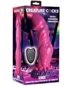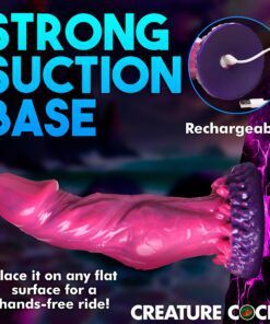 Explore your dark fantasies of giant, buzzing, alien wasps and take on this giant stinger dong! This shiny pink rod has accents of purple, a smooth and tapered tip, a curved shaft, and knots above the spiky base. The wide base provides powerful suction so you can go hands-free by placing it on any flat surface to keep it in place. You can also combine it with a compatible strapon harness for pegging play! Made out of premium, phthalate-free silicone, it has a firm core and soft, silky surface. Explore every sci-fi, fantasy, roleplay or cosplay scene you want with this epic adult toy! Use only with water-based lubricants for best results. After play is over, wash the dildo with warm water and soap and use a toy cleaner to spray clean. Wipe dry and store in a cool, dark place out of direct sunlight.