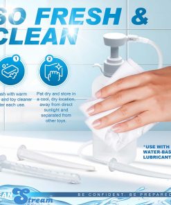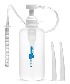Keeping yourself fresh can be as easy as washing your hair or brushing your teeth! You take the bottle, fill it up with room temperature water or saline solution, and then use the attachment of your choice. The beaded tip has a nice feel, so you choose that one first. A little lube on the tip makes it go in easy. You stand in the shower just in case there’s any mess, and then get on all fours with your backside in the air. Gravity helps guide the liquid in. You can feel the temperature of the water and the pressure building, so you stop the flow and just hold it inside, getting used to the feeling, then you squat over the toilet before removing the enema attachment and letting it all flow out!