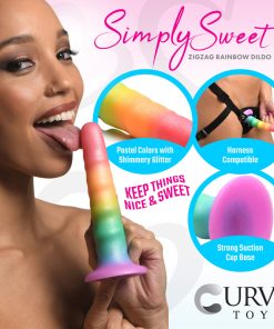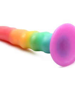 Combine fantasy and sexy play with this shimmering, rainbow colored dildo. The zigzag design of this dildo gives you alternating bumps that stimulate and massage you from within with each thrust, stroke and penetration! Made to be soft and flexible, it is easy to use for both beginners and advanced users alike. Let it bend to your will and fill you up! Made out of quality silicone so it’s phthalate-free, latex-free, non-porous and hypoallergenic. Use it only with water-based lubricants for best results. The wide base makes it compatible with most strapon harnesses so you can indulge in fantasy roleplay and pegging! Or go hands-free and enjoy the strong, suction cup base when you place it on any flat surface! To clean it, simply wash it with warm water and mild soap, then spray it with a toy cleaner and pat dry after rinsing it off. Keep out of direct sunlight and away from extreme heat.